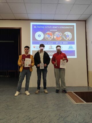 Dňa 27.11. 2024 sa traja žiaci našej školy zúčastnili krajského kola súťaže Zenit v strojárstve, ktorá sa konala v SOŠ strojníckej Považskej Bystrici. V silnej konkurencii stredných škôl z Trenčianskeho kraja obsadili v hodnotení popredné priečky. Marek Burian z II.A triedy obsadil v kategórii R zameranej na ručné spracovanie kovov 2. miesto, v kategórii S zameranej na strojové obrábanie sa Matej Monček zo IV.A triedy umiestnil tiež na 2. mieste. V kategórii C zameranej na programovanie CNC školu reprezentoval žiak III.A triedy Rudolf Fábry, ktorý obsadil pekné 5. miesto.