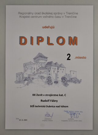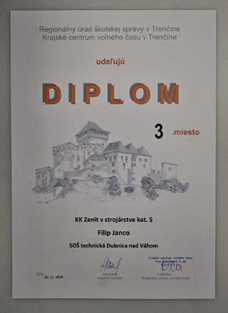 Dňa 20.11. 2025 sa konalo krajské kolo súťaže Zenit v strojárstve v SOŠ strojníckej v Považskej Bystrici. Žiaci našej školy svojimi vedomosťami a praktickými zručnosťami zabodovali v silnej konkurencii ostatných škôl v kraji. V kategórii C (programovanie CNC) sa na 2. mieste umiestnil Rudolf Fábry zo IV.A triedy, v kategórii S (strojové obrábanie) sa na 3. mieste umiestnil Filip Janco, taktiež zo IV.A triedy a v kategórii R (ručné spracovanie kovov) sa na 4. mieste umiestnil Marek Burian z III.A triedy.
