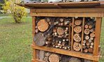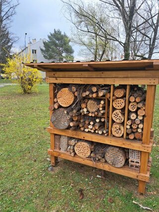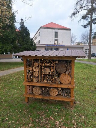 Keďže užitočný hmyz mizne z našich sadov, záhrad a parkov z roka na rok rýchlejšie a rýchlejšie, rozhodli sme sa, že sa do nášho parčíku pred školou pokúsime prilákať aspoň niekoľko druhov – včely samotárky, lienky, zlatoočky, motýle či ucholaky, pre ktoré naši šikovní majstri stolári, rezbári aj údržbári vyrobili hmyzí domček. Teda vlastne hmyzí hotel, ba priam Grand Hotel. Ten od konca apríla 2023 poskytuje úkryt pre dôležitý opeľujúci a dravý hmyz. Pevný rám a priečky sú tvorené z drevených dosák a hranolov a jednotlivé poschodia a „izby“ sú vyplnené rôznorodým prírodným materiálom: užšími aj širšími polienkami s predvŕtanými otvormi, suchými konárikmi, starými tehlami s pórmi (voštinové tehly), šiškami i kôrou stromov.